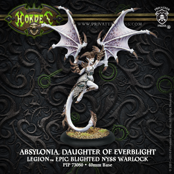 Absylonia has been no stranger to transformation and now, thanks to the gifts of Everblight, her body has settled into a stable form. On huge wings she flies over the battlefield, conveying her killing rage to the spawn that follow her. Though her own body no longer shifts, her blood is still attuned to the morphic energies of Everblight, and the ravenous spawn she commands now gain the same mutability she herself once possessed.