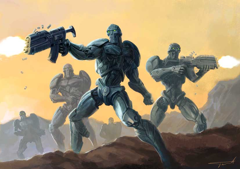 Cybertronics military forces are by far the smallest of all the corporations. What they lack in numbers they make up for in power, their military enhanced by sub-dermal armour, enhanced weapons and targeting arrays and cellular stimulators which promote rapid healing. These upgrades often give them the edge in combat against the other corporations and the Dark Legion.