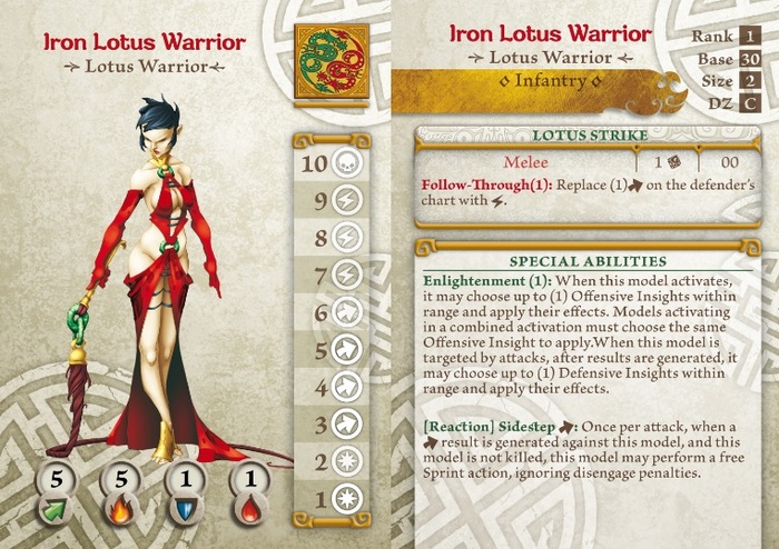 Following the usual Shael Han doctrine, the Iron Lotus Warriors have a minimal amount of abilities, which is offset by their use of Enlightenment. What sets these lovely ladies apart from the rest of the army is their use of mobility tactics (which we’ll see expanded on when we look at the Black Lotus). They have the standard attack rating of 1 and Follow-Through, giving them a nice push against Nasier and the other Parry-heavy factions, as well as having the [Reaction] Sidestep (Dodge) ability. What this does for them is if an enemy attacks them and generates a Dodge result the girls will get to make a Sprint action (ignoring disengage).
