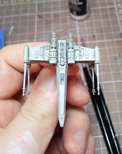 Der Grundton für den X-Wing sollte heller als zuvor sein – ein helles Grau. GW Ulthuan Grey passte perfekt. Um die Farbe besonders dünn aufzutragen, bürstete ich den Jäger vorsichtig in mehreren Durchgängen mit der Farbe trocken.