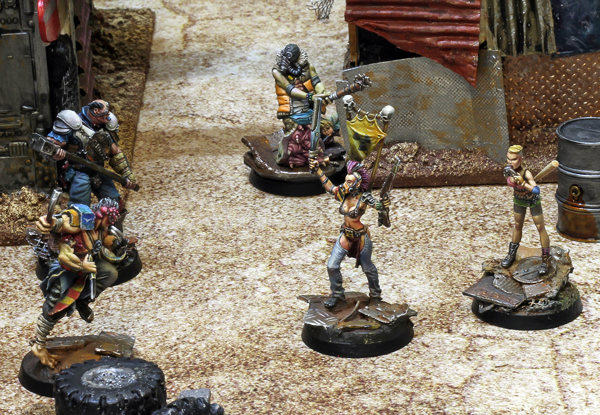 Basically our game is a fast-paced skirmish showdown between rival gangs, played with 5 to 10 30 mm scale miniatures in a post-apocalyptic, barren and desolate environment known as the Wasteland. If you are into skirmish games, wargames in general, apocalyptic settings or just like to paint superb minis made by some of the best sculptors in the market these days, this game is for you. Don’t hesitate to visit our website to know more about the background of this setting, read a bunch of short stories, watch some cool drawings and maps, or feast your eyes with the miniature galleries.