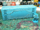 Spätestens jetzt zeigt sich, dass die Farbe für den Space Marine eher ungeeignet ist. Auf Nachfrage sagte man uns, dass die Kunststoffoberfläche zu glatt sei. Wir lassen den Marine daher vorerst in diesem Bemalzustand und widmen uns weiter dem Container von Terrakami.