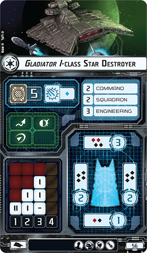 Less powerful and less resilient than the Victory-class, the Gladiator-class Star Destroyer is also less expensive, costing either fifty-six fleet points for the Gladiator I or sixty-two fleet points for the Gladiator II.
