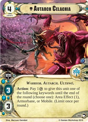 Autarch Celachia allows you to tailor his attacks to defeat his enemies by using his ability. As an Action, you can spend a resource to give Autarch Celachia either Area Effect (1), Armorbane, or Mobile until the end of the round. If you’re facing a swarm of foes, you can use Area Effect to clear them away; if you’re trying to bring down a deadly enemy unit, you can use Armorbane; and if you need to readjust your strategy on the fly, you can gain the Mobile keyword. The ability to choose any of these effects makes Autarch Celachia one of the Eldar’s most versatile units, giving you a strong way to deal with any threat.