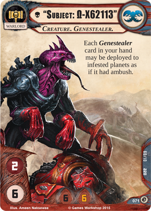 The ability to ambush any of your Genestealers into play at infested planets has immense ramifications. When “Subject: Ω-X62113” is your warlord, your opponent will have to be doubly careful. Any battle on an infested planet could turn into a bloody rout as your Genestealers ambush your opponent. Because this ability is only limited by the number of infested planets in play, your Genestealers will be able to attack without warning across the Traxis sector.