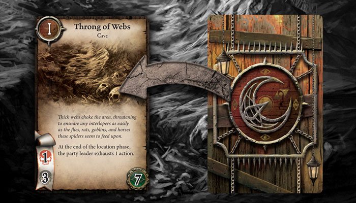 When you travel to a new location, you discard the location you just explored, along with all progress tokens on it. Additionally, you discard all enemies lurking in the shadows. Then, the party leader draws a new location card from the location deck, places it faceup in the play area, and spawns the number of enemies it indicates. Typically, these enemies engage your heroes right away, so that the first enemy engages the party leader, the second engages the next player clockwise, and so forth until all of them have been spawned.