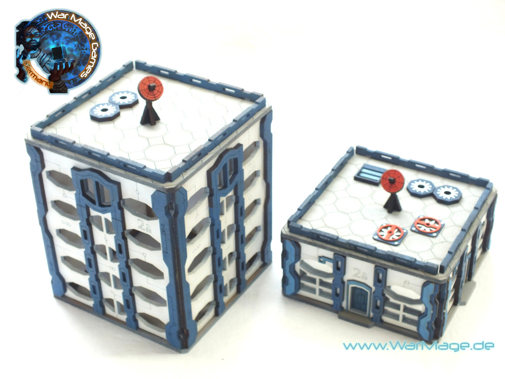 Die Gebäude sind vom Maßstab und Format an die Dropzone Commander Papp-Gebäude angepaßt. Grundfläche je 3 x 3 der DZC Felder, 10,8 cm x 10,8 cm, und ein riesiges Stadtzentrum mit 9 x 9 DZC Feldern Größe.