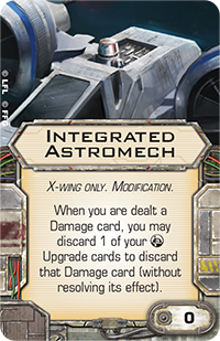 Notably, even as the expansion’s upgrades provide a natural fit for the T-70 X-wing and pilots such as Ello Asty , they also provide a significant boost to the classic T-65 X-wing flown by such renowned Rebel Alliance pilots as Luke Skywalker and Wedge Antilles . The biggest part of this boost comes from the new „X-wing only“ modification, Integrated Astromech, which allows you to discard an astromech upgrade to discard any damage card you are dealt before you resolve its effects.