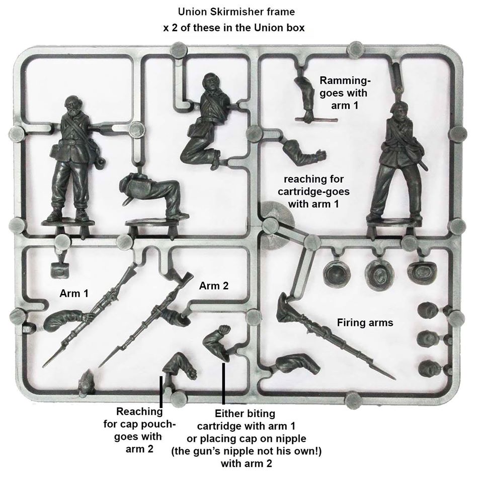 We can now show you the skirmish frame for the Union Infantry box. Here are a few examples of them made up plus pics of what you can do with the entire box. As mentioned before there are more loading arms on the main frame and you can attach ‚charging‘ arms to the static figures to give a defensive look to them.