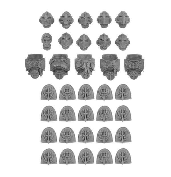 This multi-part resin and plastic set contains the components necessary to assemble a twenty-man Legion Tactical Squad in Mark IV power armour for the Raven Guard Legion, including twenty resin Raven Guard Legion MkIV Shoulder Pads, ten Raven Guard Legion Heads and five Raven Guard Legion torsos to mix throughout the squad. The kit also includes an impressive selection of optional weapons and wargear such as combat blades, ammo packs, holstered bolt pistols, frag and krak grenades and several weapon options for the squad sergeant. Supplied with twenty 32mm round bases.