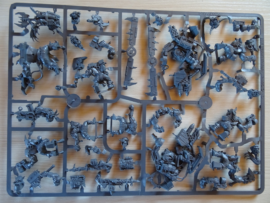 Im Schuber befinden sich insgesamt 4 Gussrahmen. Ein gemischter Ork / Ultramarinegussrahmen und 3 weitere Gussrahmen für die Orks, wobei die beiden kleinen Orkgussrahmen identisch sind.
