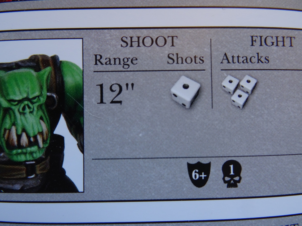 Wir sehen dass unser Ork mit seinem Shoota 12 Zoll Reichweite hat. Für den Beschuss steht ihm 1 mickriger Würfel zur Verfügung. Im Nahkampf schlägt der Ork hingegen mit 3 Würfeln ordentlich zu. Dann erkennen wir noch dass der Ork mit 6+ schlecht gerüstet ist und auch, wie die allermeisten Modelle, nur 1 Lebenspunkt besitzt. Ein Bewegungswert ist nicht angegeben, da alle Einheiten des Startsets, mit Ausnahme des Deffkoptas, standardmässig 6 Zoll Bewegung haben.