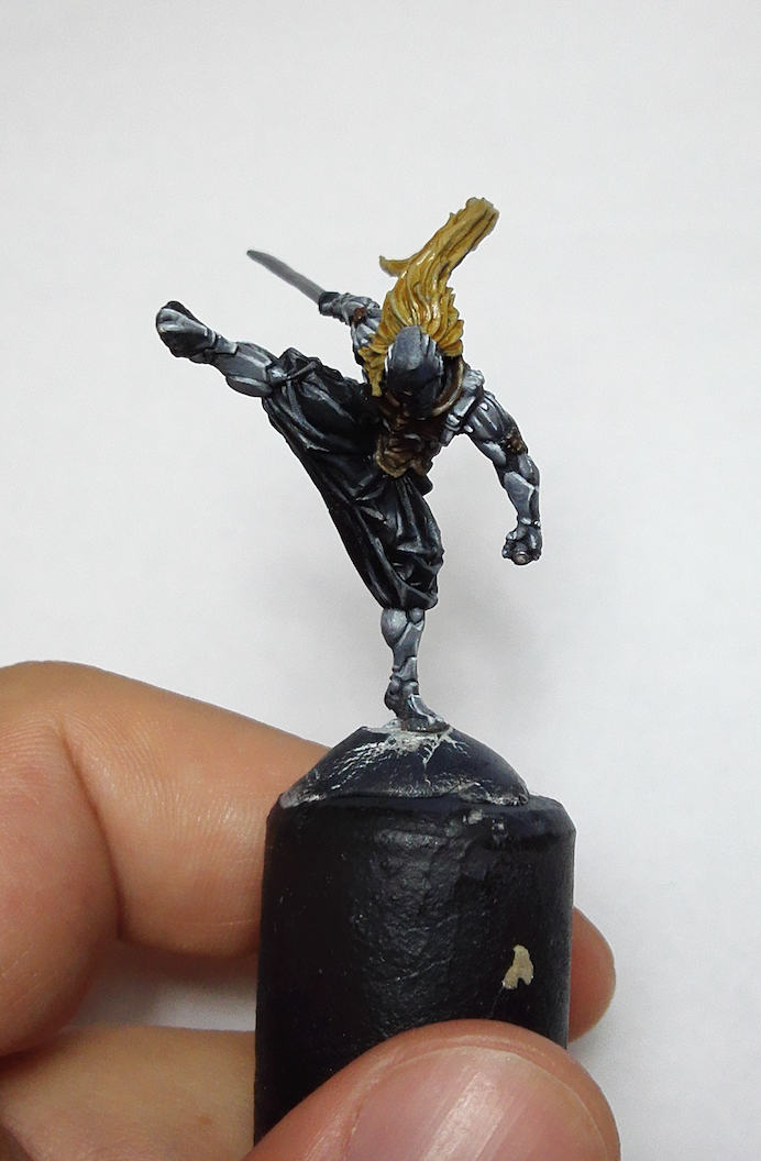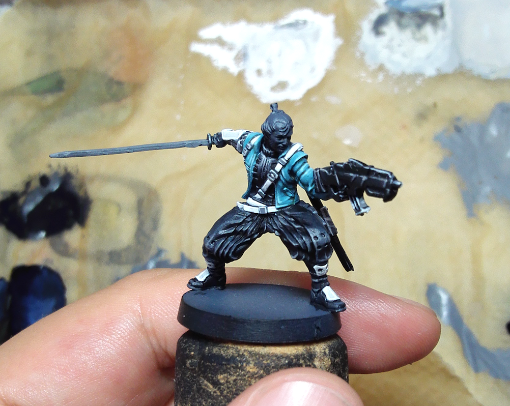 Für ein Einzelmodell machte Vorzeige-Ninja Togan erstaunlich viel Mühe. Zum einen sind da die sehr detaillierten Armpanzerungen, zum anderen die merkwürdige Pose. Letztere wirkt zwar ungemein dynamisch, macht die Bemalung sowie Fotos des Oberkörpers jedoch verhältnismäßig schwierig. Da einige der Details des Torsos sowie des Kopfes nicht so scharf modelliert waren, wie es bei neueren Corvus Belli Miniaturen der Fall ist, musste ich versuchen, diese Details nur anhand der Bemalung herauszuarbeiten. Zu guter Letzt war auch der beeindruckende Haarschweif mit Aufwand verbunden.