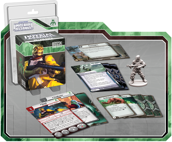 You may also include Bossk in your strike team for a skirmish game. Two new skirmish missions introduced in this figure pack challenge you to navigate the dangers of a Wasskah Hunting Ground, and an assortment of new Command cards introduce unexpected and unpredictable maneuvers. For instance, you may play Wild Attack when you declare an attack to immediately add one red die to your attack pool! In exchange, however, you must add a white die to the defending figure’s dice pool. If you need to destroy a powerful figure in a single attack or suffer the consequences, Wild Attack might give you the edge you need.