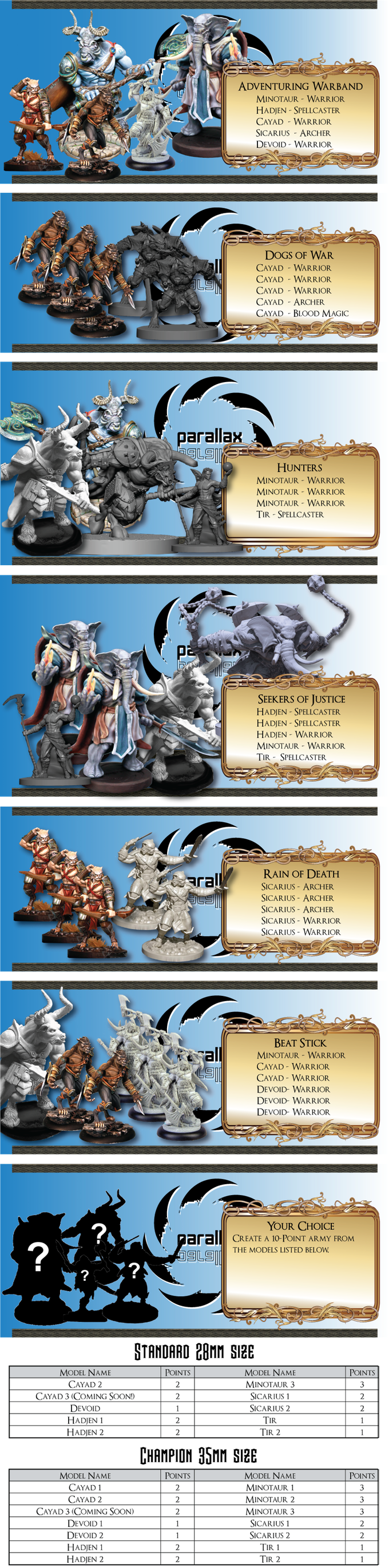 Parallax: Warband is a fast-paced skirmish game set in a world of high fantasy. Players build a Waband of highly customizable adventurers and mercenaries to complete missions and foil the plans of their enemies. A Warband may be as diverse or race-centered as a player chooses; representing mercenaries and/or faction-led parties alike.