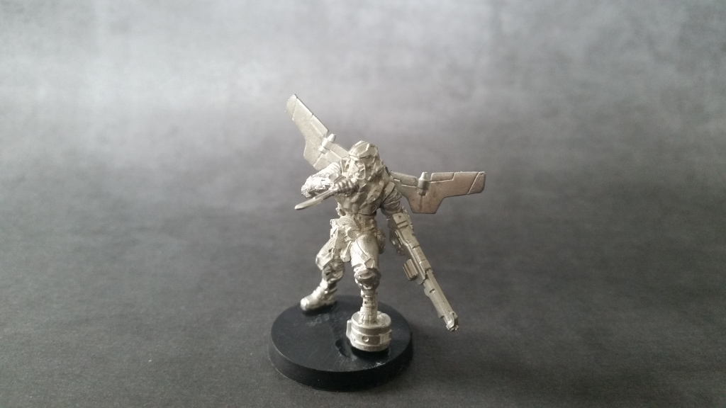 Die Special Deterrance Group Azra’il machte schon etwas mehr Arbeit. Wie man auf dem Bild mit den Einzelteilen sieht, war gerade die Waffe voller Gußnasen. Aber auch diese Miniatur war, wie man es von Corvus Belli gewohnt ist, sehr passgenau.