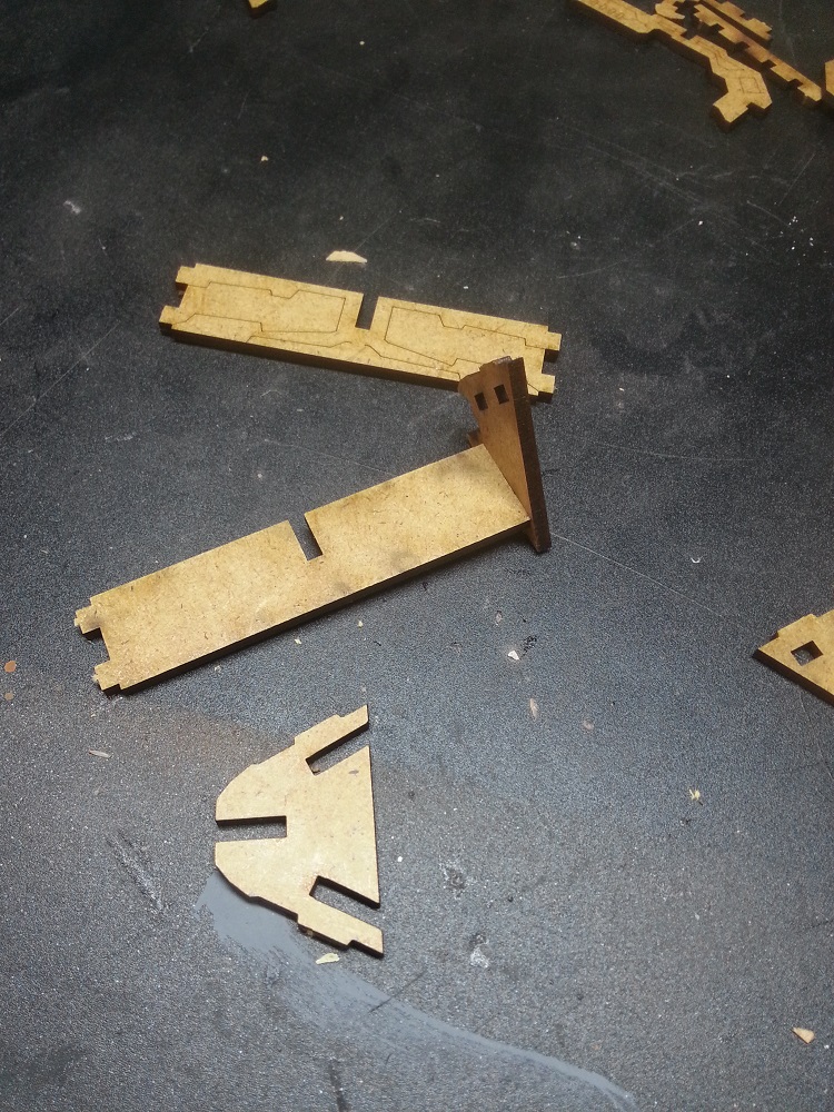 Die Schutzfolie benötigt etwas Kraft, um diese von den Holo Ads herunterzuziehen. Nach dem Abziehen fällt direkt auf, dass die Farben der Holo Ads nun etwas kräftiger sind. Die Holzteile lassen sich in den meisten Fällen mühelos aus dem Rahmen herausbrechen. Nur an manchen Stellen benötigt man die Hilfe eines Cutters. Vor allem bei kleineren Teilen sollte man hier mit dem Werkzeug arbeiten. Während des Herausbrechens fällt auf, dass der Platz auf dem Rahmen wirklich gut genutzt ist, um nicht viel Material zu verschwenden. Das Zusammenstecken der einzelnen Teile geht mit etwas Kraft recht einfach von der Hand, da die Teile gut ineinander passen. Wichtig ist hier hin und wieder mal einen Blick auf die Anleitung zu werfen, denn die Reihenfolge des Zusammenbaus ist stellenweise wichtig. Beispiel: Für die große Holo Ad Werbung ist es wichtig, dass bei der Basis das Mittelstück zuerst mit den Schrägen verbunden wird, da man es sonst nicht mehr dort hineinbekommt.