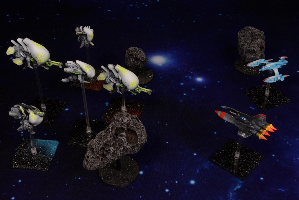 Die Bemalung der Astivar Raumschiffe mit den Grautönen und den Leuchteffekten der Schilde ist Dir sehr gelungen… …der Style passt prima zu den eher organischen Formen der Modelle