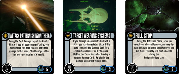The Scimitar Expansion Pack includes three Elite Talents to add to your roster. Attack Pattern Shinzon Theta is a powerful card that adds 1 additional damage to the target ship’s Shields for every uncancelled [critical hit] result. You must discard this card afterwards. Target Weapon Systems allows you to search the damage deck for a “Munitions Failure” or a “Weapons Malfunction” card, instead of drawing a random Damage Card, whenever you damage an opponent’s hull with a [critical hit] result. Re-shuffle the Damage Deck when you are done. Finally, Full Stop allows you to discard this card and ignore your chosen maneuver, electing to not moving. You still take an Action during the Perform Actions Step.