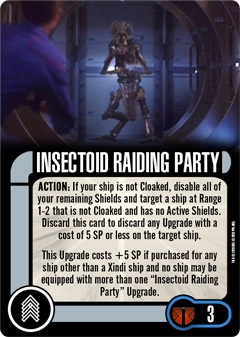 Insectoid Raiding Party is a Crew Upgrade that allows you to discard this card in order to discard any Upgrade with a cost of 5 SP or less on the target ship when that ship is within Range 1-2, is not cloaked, and has no Active Shields. In order to perform this action your own ship must also not be cloaked and you have to disable all of your remaining Shields. For only 3 SP this upgrade can be a great way to deal with troublesome upgrades like Cheat Death.