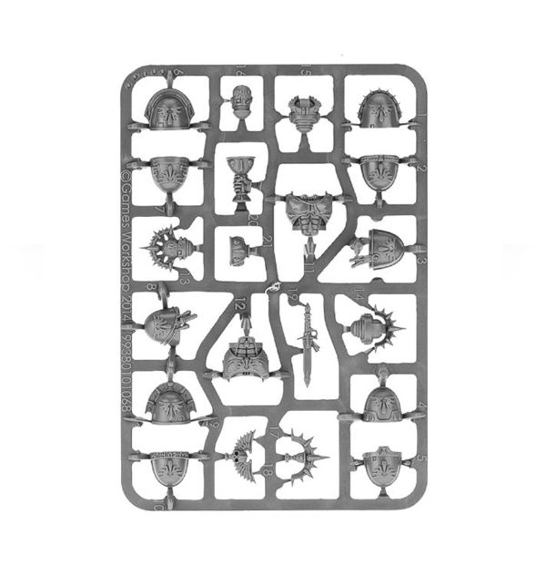 Außerdem ist ein Upgrade-Set der Blood Angels enthalten. Es ist vollständig kompatibel zu allen bereits bestehenden Bausätzen der Space Marines und enthält einen Gussrahmen mit aufregenden Teilen für Fans der Blood Angels. Die folgenden zwanzig Teile sind enthalten: