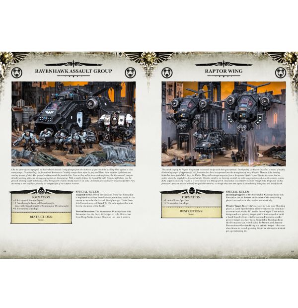 – Hintergrund und Organisation der Orden der White Scars, Imperial Fists, Iron Hands, Salamanders und Raven Guard sowie ihre typischen Strike Forces;