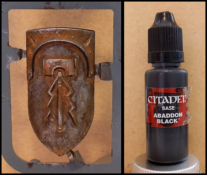 By popular demand, I prepared a step-by-step of how I painted the rusted armour on my Shadespire Stormcast pair from earlier. I’ll demonstrate it on a spare Liberator shield.