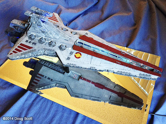 Es folgt dieser „Venator“ Sternenzerstörer der Republik. Auf Basis des Revell-Kits hat Doug Scott dieses Modell mit Lichtern, startenden Dropships und mehr aufgebessert:
