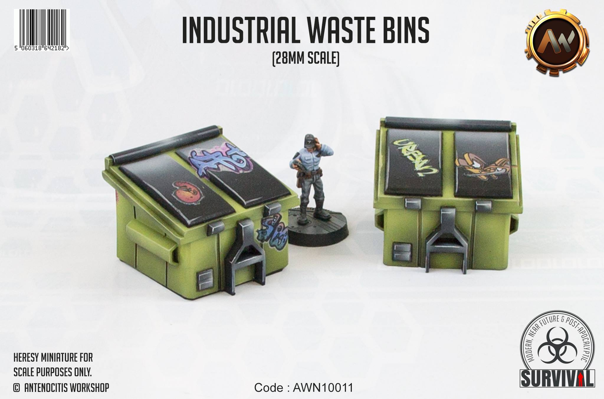 Industrial Waste Bins for a modern or real world table. The Industrial Waste Bins are 28mm scale, and are prefect for zombie apocalypse or near future games. Place with wrecked cars and other street scatter to get a thematic and detailed table. Industrial Waste Bins are a set of 2, each a single piece.