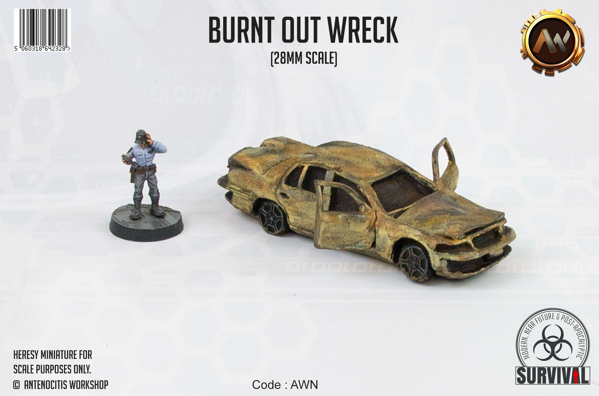 The Burnt-Out Wreck is obviously a car that has been set alight and recently burnt. This car is 28mm scale, and is perfect scenery for either a post apocalyptic warzone or a zombie survival scene. The Burnt-Out Wreck is a multi-part resin model, scaled appropriately, and has a wide use in may wargames or board games.
