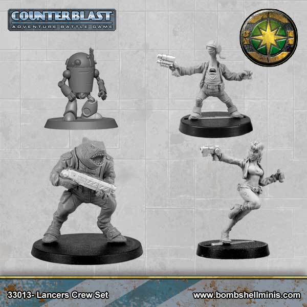In keeping with the nostalgic feel of CounterBlast, we’re also pleased to offer an all new starter set for those beginning their adventures in the Outer Reaches or those wishing to expand their existing crews. This Counterblast Lunchbox Edition starter set comes in a color printed tin lunch box adorned with new art depicting the enterprising Lancer Captain Wanda Whitestar and her intrepid crew by the talented Giorgio Baroni. This starter set will include two custom-cut tray inserts manufactured by Battle Foam™ to keep your crews safe as they travel with you from game to game. You will be able to select two of the five depicted faction crews to be included in your set. These miniatures are cast in metal and/or high quality polyurethane resin. In addition, you will receive color statcards for each crew model, two quality Chessex® d10 “Moxie” dice sets in faction-related colors, a Counterblast tape measure, and a handy black and white quick-start rulebook.