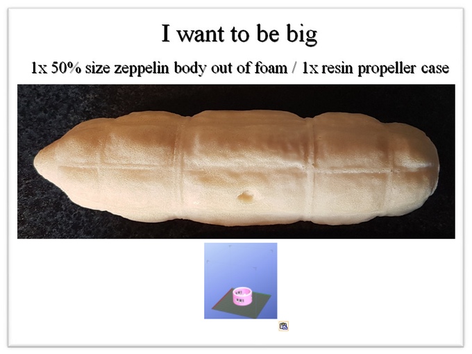 2. Raise enough funds to build the big silikon molds for producing the zeppelin body out of foam and the other parts out of resin.