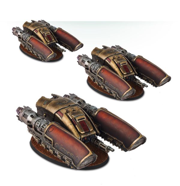 Not as heavily armoured as the other vehicles of the Legio Custodes, a full Pallas Grav-attack Squadron has the firepower and agility to hound and destroy larger targets whilst avoiding the enemy’s assaults.