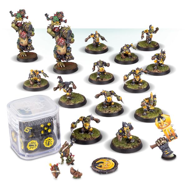 Hoffentlich drehst du die Miniaturen in diesem Paket in die richtige Richtung und spornst sie zum Ruhm an – 12 schröckliche Blood-Bowl-Spieler der Orks aus Kunststoff – 2 Blitzers, 2 Throwers, 2 Black Orc Blockers und 6 Linemen. Außerdem ist ein Blood-Bowl-Troll dabei, ein mächtiges Biest, das liebevoll als mehrteiliger Kunststoffbausatz gestaltet wurde, und ein Satz Blood-Bowl-Würfel in den Farben der Gouged Eye: