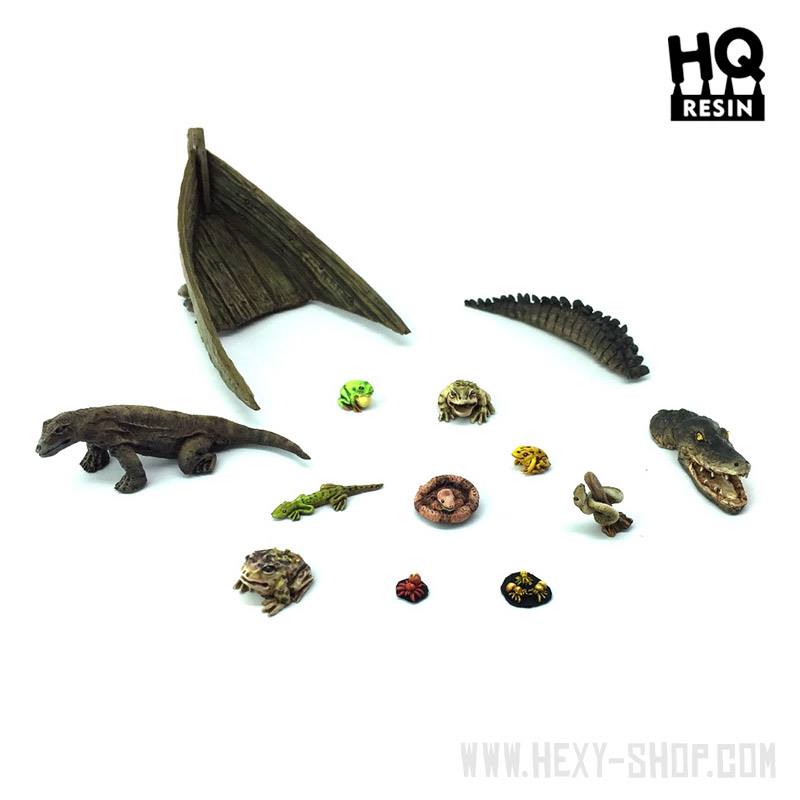 This kit contains 13 resin elements: Alligator (two parts: head and tail) Large Lizard Small Lizard 2 Large Toads 2 Frogs Snake Snake on a branch two small parts with the Spiders (one with 1 spider, second with 3 spiders) Boat Wreck Ideal for use with 28mm-32mm scale models.