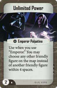 Palpatine’s command cards amplify these powers by extending their range—with Unlimited Power —and to coordinate them.