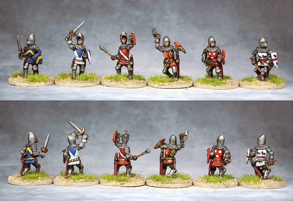 We are very pleased to release six new codes for our 15mm later 14th century range, the first sets of men-at-arms on foot, and more sets of infantry. As most men-at-arms fought on foot in this period rather than mounted, these releases permit the gamer to build the basic components of armies of the period — either an English herce (longbows flanking men at arms) or the French men at arms formations with crossbows supporting at a distance. In addition to the men-at-arms (these first sets are in jupons), we also have pavisiers, crossbowmen, and armed peasants. (Please note these are the larger „15mm“ figures pioneered by Testudo which are now the size offered by several manufacturers.)