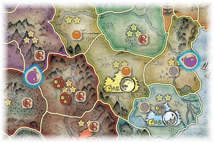 When the resolution phase ends, the victorious daimyō claim the spoils of war. If you control all of the provinces within a territory, you’ll gain the territory card for that region, offering an edge that you may use during the next round. Alternatively, should you fail your clan and lose all provinces under your control, you’ll become a wandering ronin. In this event, the only way to regain your land and honor is to strike anywhere you see an opportunity. Ronin can place combat tokens on any border during the placement phase until they have reclaimed a province to act as the base of their clan.
