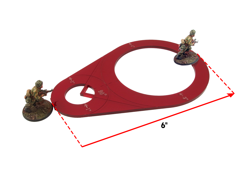 Laser cut acrylic piece designed to fit various gaming system and serving as explosion template, arc and range ruler combined.
