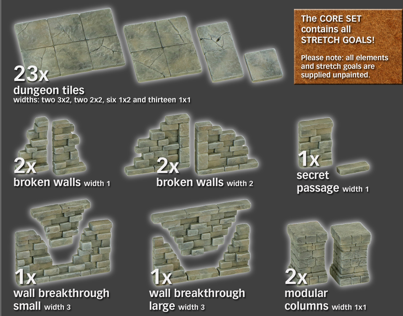So everybody who pledged for any early bird set still gets his/her set of choice (of course) with all stretch goals and delivery end of November as you surely know. But from now on only the regular sets are available, which also contain all stretch goals – but they will be delivered at the end of March 2018. I decided this to say thank you to all previous supporters and reward their confidence with the fast early bird delivery by end of November. And to make MODULAR DUNGEON more appealing to upcoming supporters.