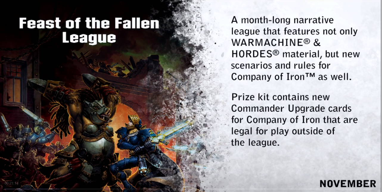 Die Ligen sollen jeweils einen Monat lang gehen und sowohl Material für Warmachine/Hordes als auch für Company of Iron und das Iron Kingdoms Rollenspiel enthalten.