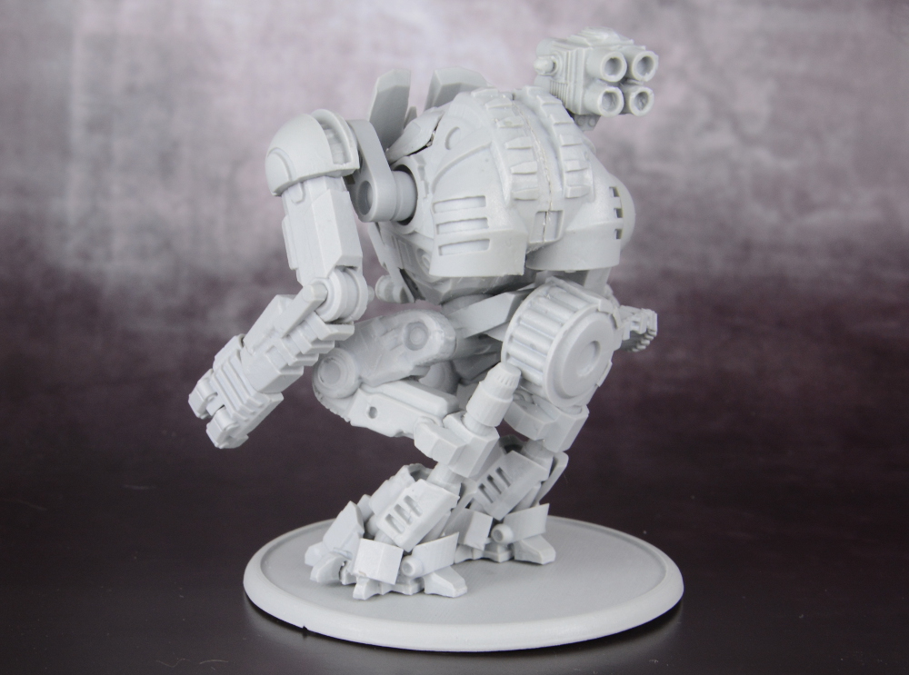 Der Zusammenbau war einigermaßen komplex, vor allem die mehrteiligen Beine und Arme so zu arrangieren, dass sie vernünftig passen, war nicht ganz einfach. Bei den Armen haben wir die Pose im Vergleich zur Anleitung (in der der Mech die Waffe in beiden Händen hält) verändert, was die Sache etwas einfacher machte. Als Folge mussten wir den Munitionsgurt mit heißem Wasser in Form biegen, aber das war die kleinste Übung und funktionierte gut (auch wenn wir ihn an der Waffe evtl noch einmal lösen und schöner verkleben werden).