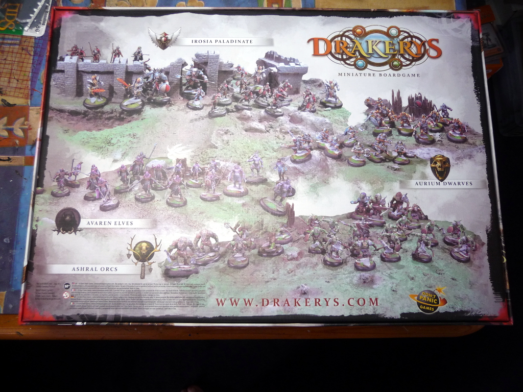 Wer nun auf dem Karton bekannte Namen entdeckt hat: Drakerys stammt aus der Feder desselben Erfinders wie Eden und hat sich ebenfalls dessen Grundkonzepte auf die Fahnen geschrieben: einfach zu lernen, schwer zu meistern und nach 6 Runden ist alles vorbei. Darüber hinaus geht Drakerys in der Vermarktung etwas andere Wege. So wird zum Beispiel immer wieder von einem „Miniature Boardgame“ gesprochen obwohl es sich bei dem Spiel um ein lupenreines Mass-Skirmish handelt. Wir werden später aber noch einmal kurz darauf eingehen. Nun öffnen wir erst einmal die Box.
