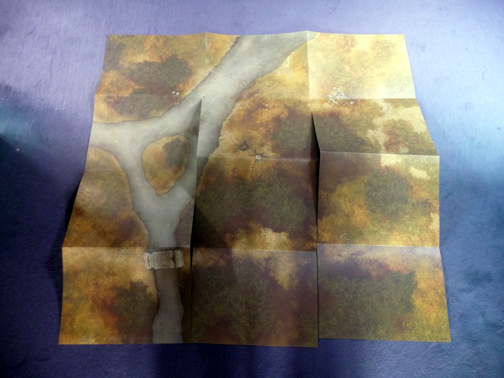 Das Spielfeld ist das Erste, was einem beim Auspacken entgegenspringt. Es besitzt die Maße 90 x 90 cm und besteht aus stabilerem, schwerem Papier. Die Maße entsprechen einer Standardpartie Drakerys, hier wurde also nicht gespart. Die beiden Motive sind schick anzusehen, wenn auch etwas trist. Die vorherrschende Farbe ist Braun in unterschiedlichen Schattierungen. So ohne Weiteres haben wir es nicht geschafft das Spielfeld auf die Schnelle dazu zu bewegen plan aufzuliegen, und das Zusammenfalten erinnert an Beipackzettel von Medikamenten. Die kriegt man auch nie wieder so zusammen wie sie geliefert wurden…