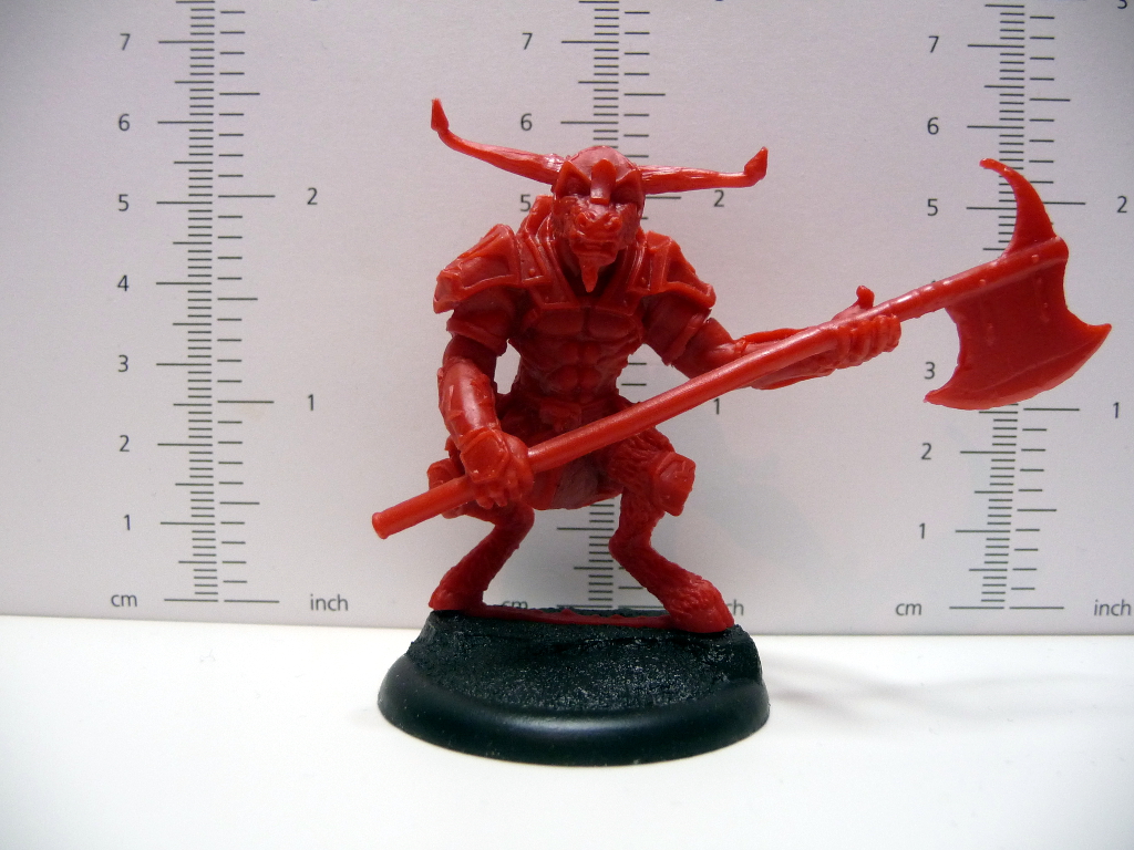 Bevor wir uns die Miniaturen genauer anschauen, vielleicht ein paar allgemeine Dinge: Ja, das ist PVC, allerdings ein sehr hartes, das offenbar einige besondere Eigenschaften hat. Der leidtragende Minotaurus, dessen Kopf für diesen Test herhalten musste, wurde mit Plastikkleber wieder zusammengefügt. Und damit sind wir bei einer weiteren kleinen Besonderheit von Drakerys (und der Antwort auf die Frage warum der Minotaurus seinen Kopf verlor): In seinem Versuch, das Spiel auch für Brettspieler interessant zu machen, setzt Drakerys auf fraktionsabhängig gefärbtes Plastik und steckbare Waffenarme und Köpfe. Ein gewöhnlicher Waffenträger z.B. kommt mit Optionen für Handwaffe und Schild, Helebarde und Schild und Bogen. Das ergibt dann tatsächlich auch 3 unterschiedliche Profile mit unterschiedlichen Punktkosten: Waffenträger, Helebardenträger und Bogenschütze. Im 2-Spieler-Starterset sind allerdings keine optionalen Teile enthalten und die Modelle sind fest verklebt. Darüber hinaus verfügen Drakerys-Miniaturen über gestaltete Bases.