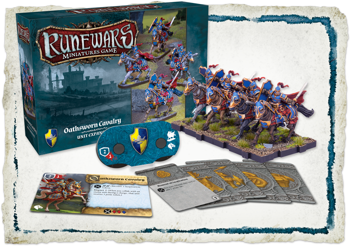 With the Oathsworn Cavalry Unit Expansion, you gain four new Oathsworn Cavalry figures—enough to field a two-tray unit or increase the size of another unit. These fearsome knights are sworn to fight for the Daqan Lords and protect the realm, and they are first introduced in the Runewars Core Set. We’ll take a closer look at these cavalry in our preview of the Daqan Lords forces, but this unit expansion is a perfect way to quickly increase your cavalry and unlock new options with five new upgrade cards for any army.