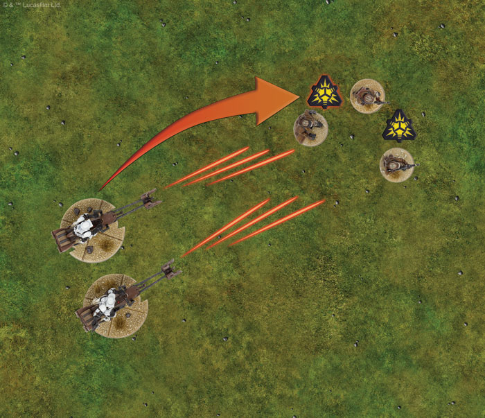 Every trooper unit has a yellow courage value, listed directly below its wound threshold. If a unit has a number of suppression tokens that equals or exceeds its courage value, that unit is suppressed and loses an action. In the example below, the Rebel Troopers receive a second suppression token after coming under fire from the 74-Z Speeder Bikes. If they’re unable to shake off these suppression tokens, the Rebel Troopers lose an action on their activation.