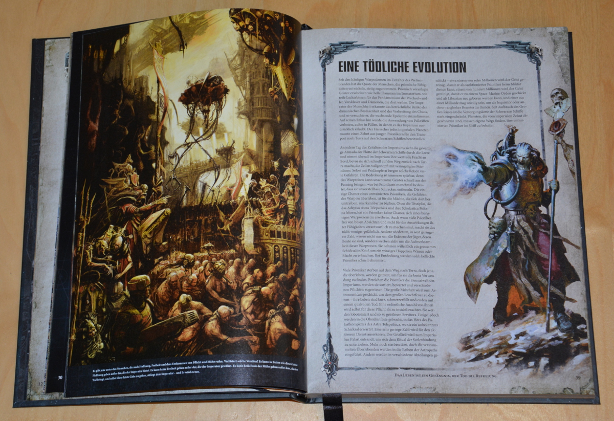 Das Hardcover-Regelwerk ist ein unglaublich edel aufgemachtes Buch. Das fängt beim teilglänzenden Einband an, setzt sich beim Lesebändchen fort und zieht sich durch die gesamte vollfarbige Gestaltung des Innenteils. Das Buch bietet beim ersten Durchblättern wirklich so ziemlich alles, was man sich wünschen kann: eine Einführung in die Spielwelt, Informationen und erste Schritte zum Hobby, den Hintergrund, die Spielregeln, Szenarios, und, und, und… Man kann bei GW ja immer wieder über alles mögliche meckern, aber dieses Buch ist wirklich schön geworden und auch seinen regulären Preis absolut wert.