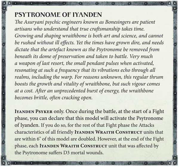 These Craftworld Attributes are paired with a range of Stratagems, Warlord Traits, no less than two vastly expanded psychic disciplines and powerful Remnants of Glory. Just check out the Psytronome of Iyanden: