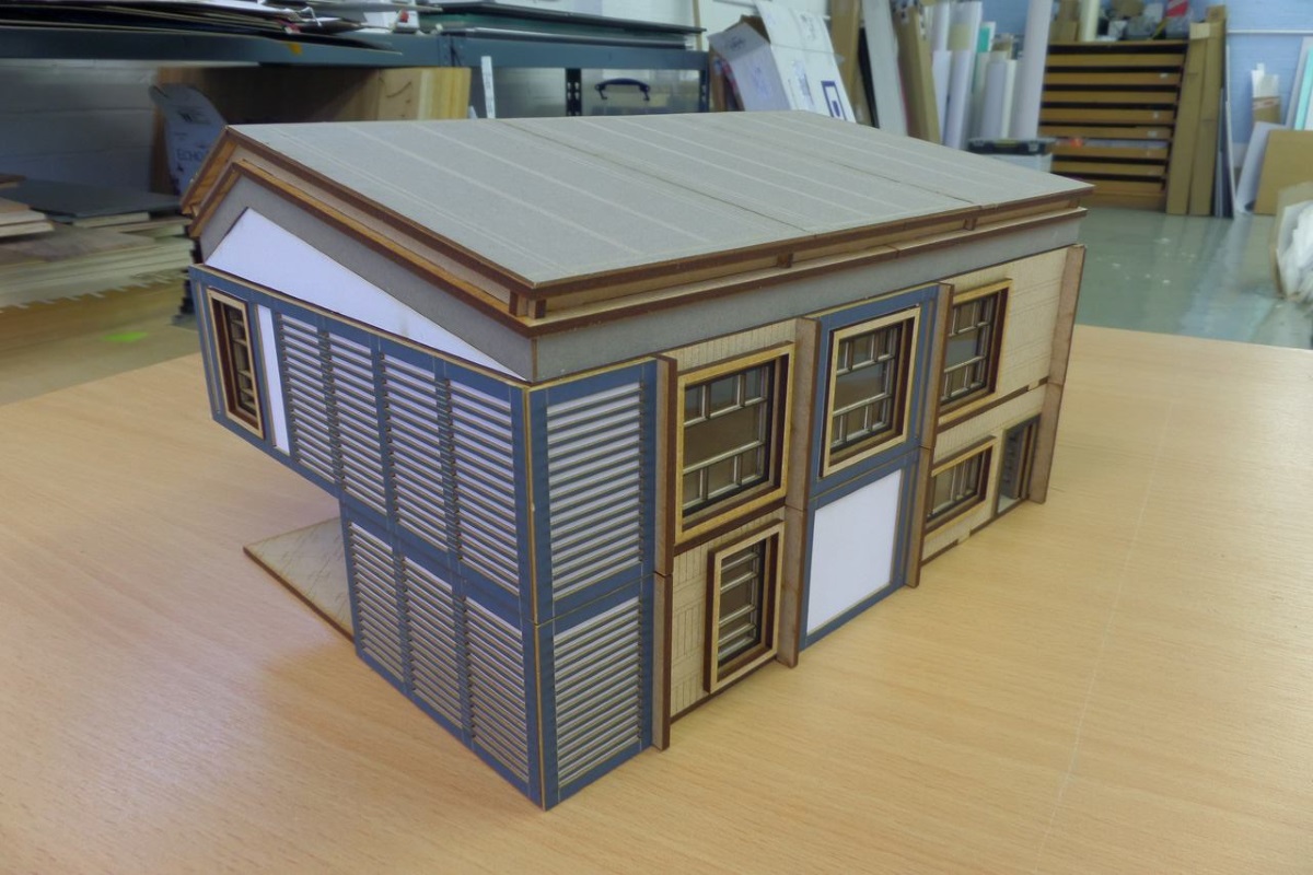 I spent last night gluing together the second of our new ultramodern warfare buildings to check for any last tweaks before setting up the production files. This one had some interior remodelling from the first prototype; can you believe I left out the toilets??? A minor adjustment to the stair opening on the first floor and she’s good to go!